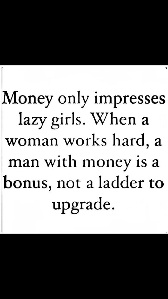 I absolutely abhor the first sentence in the picture. The second is more tolerable. The truth is that we live in a materialistic society and there’s little chance of that changing anytime soon. Maybe one of the reasons I hate that sentence is that it implies that you won’t care as much about the money if you have some of your own or you aren’t lazy. Money impresses more than just lazy people. And we all know people who work extremely hard but have absolutely nothing to show for it. People who want to accomplish things with their lives don’t want to be with someone who holds them back. Working hard isn’t all that’s necessary. There are other things that must be present. Love does not pay bills and having a man with money can not only be a bonus but also an upgrade. I’m against that as one’s only plan out of poverty but one of THE smartest financial decisions a woman can make is to get married. If you bring something substantial to the table, I feel like you shouldn’t feel bad that his net worth is also calculated with his marriage ability rating. If I’m merging my life with yours I want to come out with a better deal than I went in with. It doesn’t always have to be money but that will play a pretty sizable part. I agree that money doesn’t bring happiness but I personally would rather cry in my BMW than on my bike.